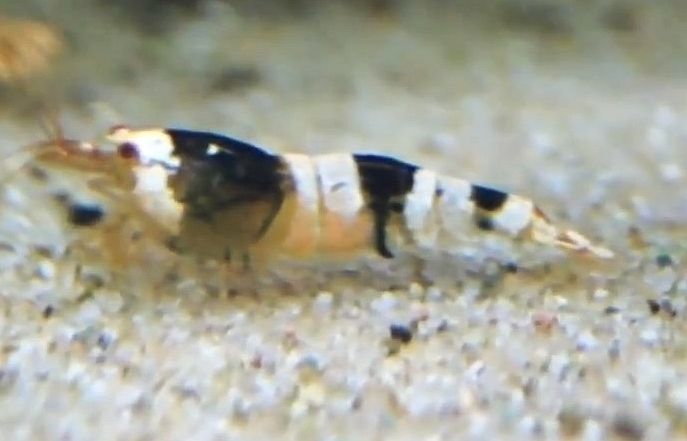 Wild Bee Shrimp (Caridina cf. cantonensis) have a clear body with a broad rough pattern of brown to black splotches and white stripes.