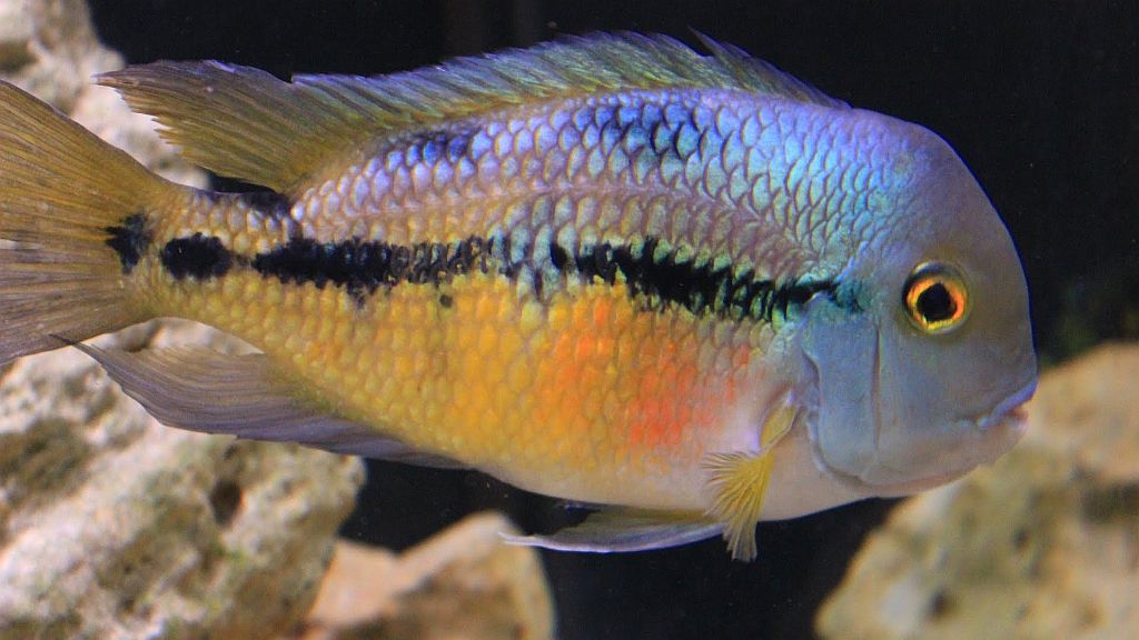 Males have a dark edging on their scales that give them a reticulated appearance. Males are larger than the females, have a much more pointed dorsal fin, and develop a hump on their head which often becomes permanent in aquarium specimens. Females are generally more brightly colored than the males. Several color variations exist that are dependent on where the specimens are collected from.