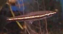 The Two Stripe Pencilfish is a small, elongated species that has two prominent dark (usually maroon colored) horizontal stripes along the body. One along the lateral line from the base of the tail through the lower portion of the eye, and the other above along the upper portion of the body.
