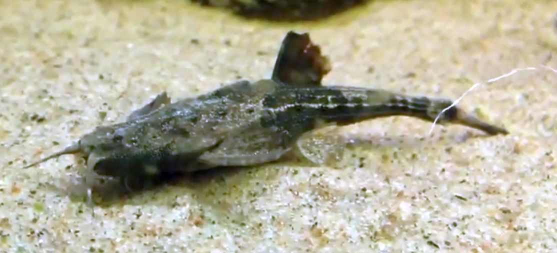 The Banjo Catfish (Bunocephalus coracoideus) known to tropical fish keeping enthusiasts as Guitarrita or Bicolor Banjo Catfish is a peaceful species found in the leaf littered creeks and ponds of the Amazon River basin in Brazil, Bolivia, Peru, and Uruguay.