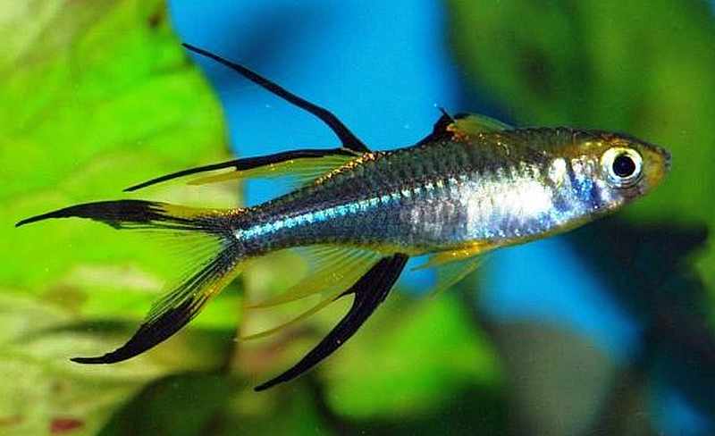 The Celebes Rainbow fish is a peaceful, slender, almost transparent schooling species that has a blue stripe that runs along the lateral line of the body. Males are larger, darker colored than females, and have more elongated black colored, second ventral and dorsal fins.