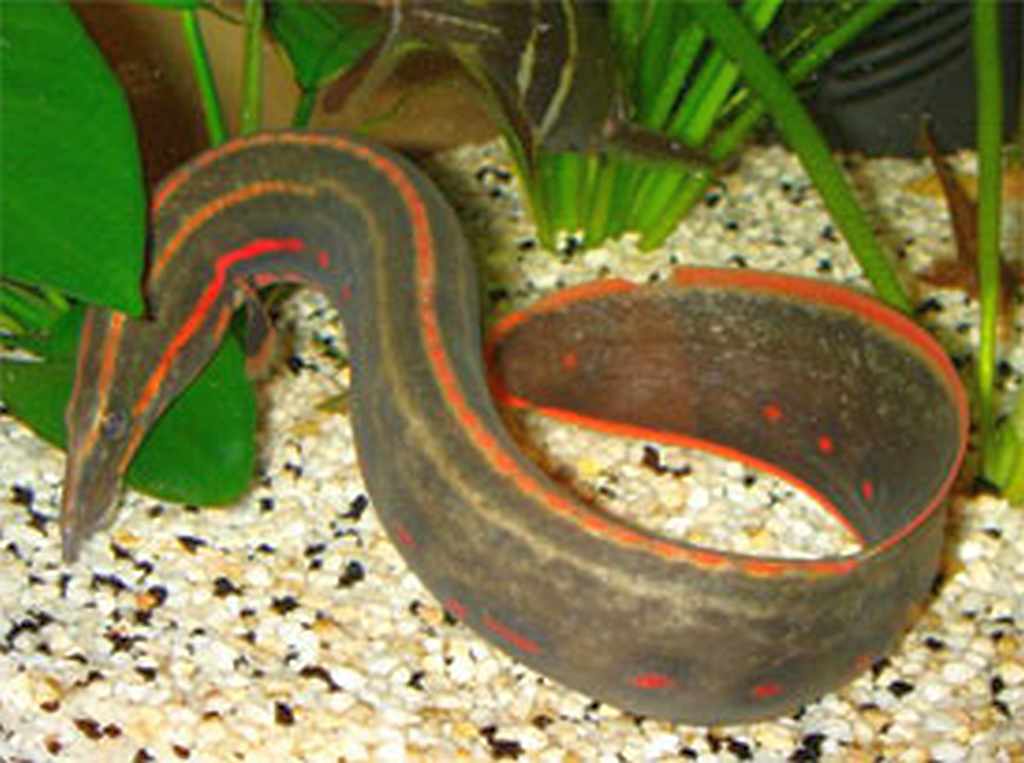 Fire Eels are voracious nocturnal predators that usually inhabit slow to briskly moving rivers with fine sediment bottoms and spend most of their daylight hours buried in the substrate with only their snouts visible. They emerge at dusk to forage on small fishes, worms, and crustaceans.