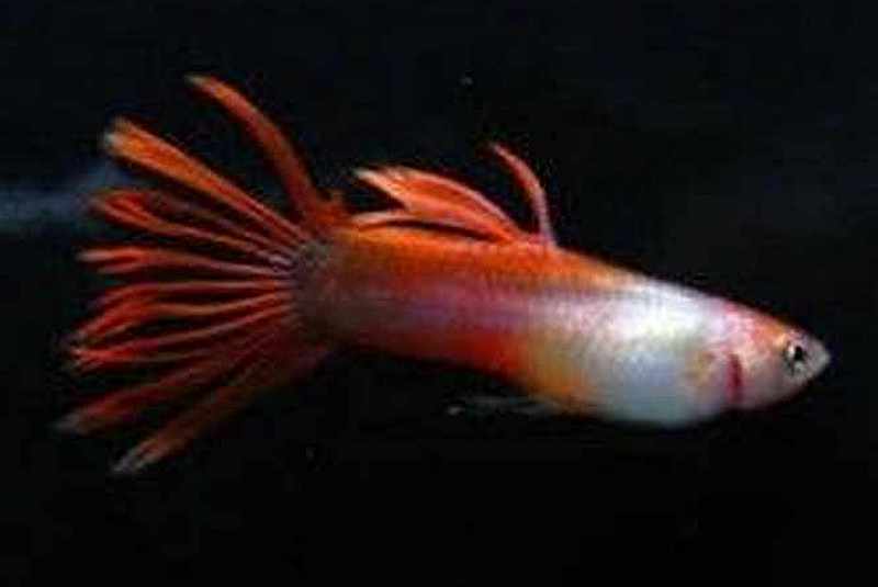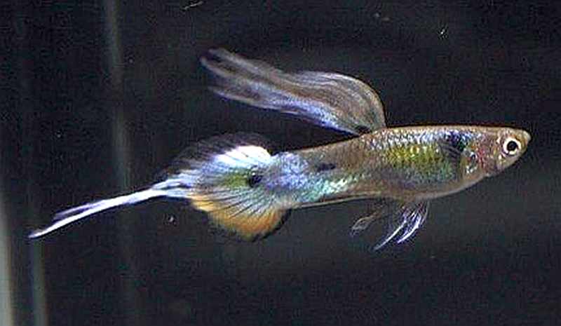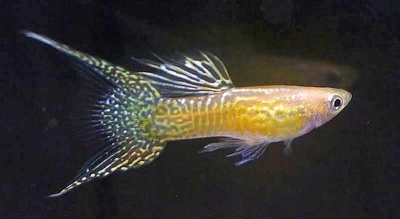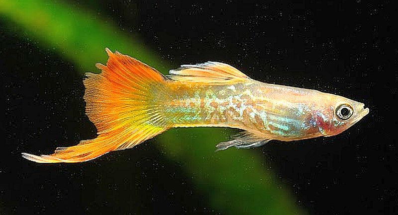 Male guppies are always much smaller than females, however their dorsal, anal, and caudal fins are usually much longer and colorful. Female guppies are usually much larger, drab in color, and lack the ornamental fins that adorn the males. Wild caught Guppies are much less colorful than their domestically bred counterparts however, through selective breeding, many unique color strains, body color patterns, and caudal fin types have been developed over the years to provide tropical fish keeping enthusiasts a plethora of choices for stocking peaceful community aquarium. These strains are generically called Fancy Guppies.