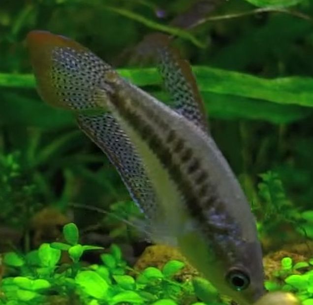 The Sparkling Gourami has a dorsal fin that is set well behind the base of their pectoral fins. They have a long single pointed spiny pelvic fin ending with a filament, pectoral fins that end in a single spiny ray, and a semi rounded caudal fin.